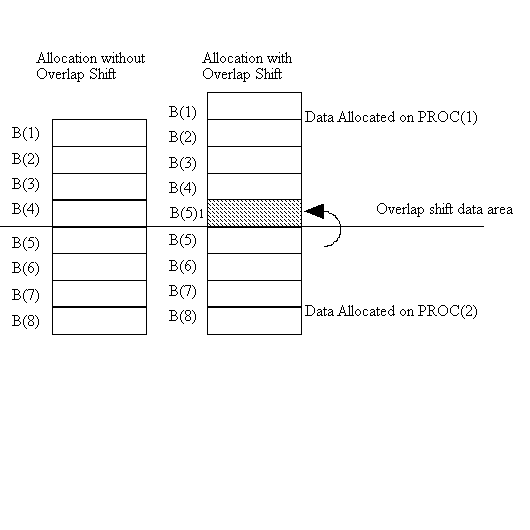 - Overlap shift. A BLOCK-distributed array is involved in a shift communication pattern. The local array section is enlarged by the shift amount, and the boundary elements are transferred from neighboring processors.