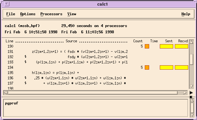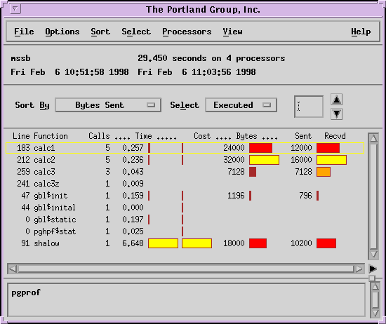 The PGPROF GUI allows a user to view the program source for any known function in the line profiler window whether or not line level profile data is available simply by selecting the function name. Since interpreting profile data usually involves correlating the program source and the data, the source interaction provided by the GUI greatly reduces the time spent interpreting data. The GUI allows users to easily compare data on a per processor basis, and identify problem areas of code based on processor execution time differences for functions or lines.- Graphical Display of Data